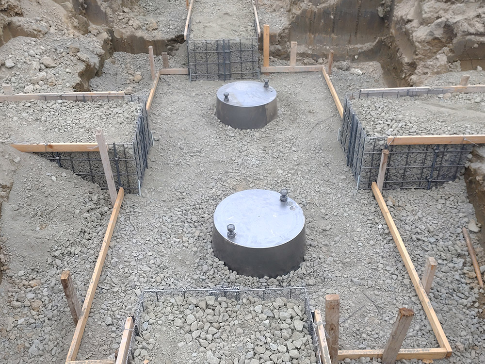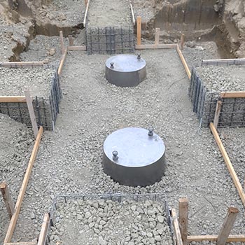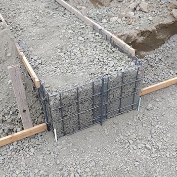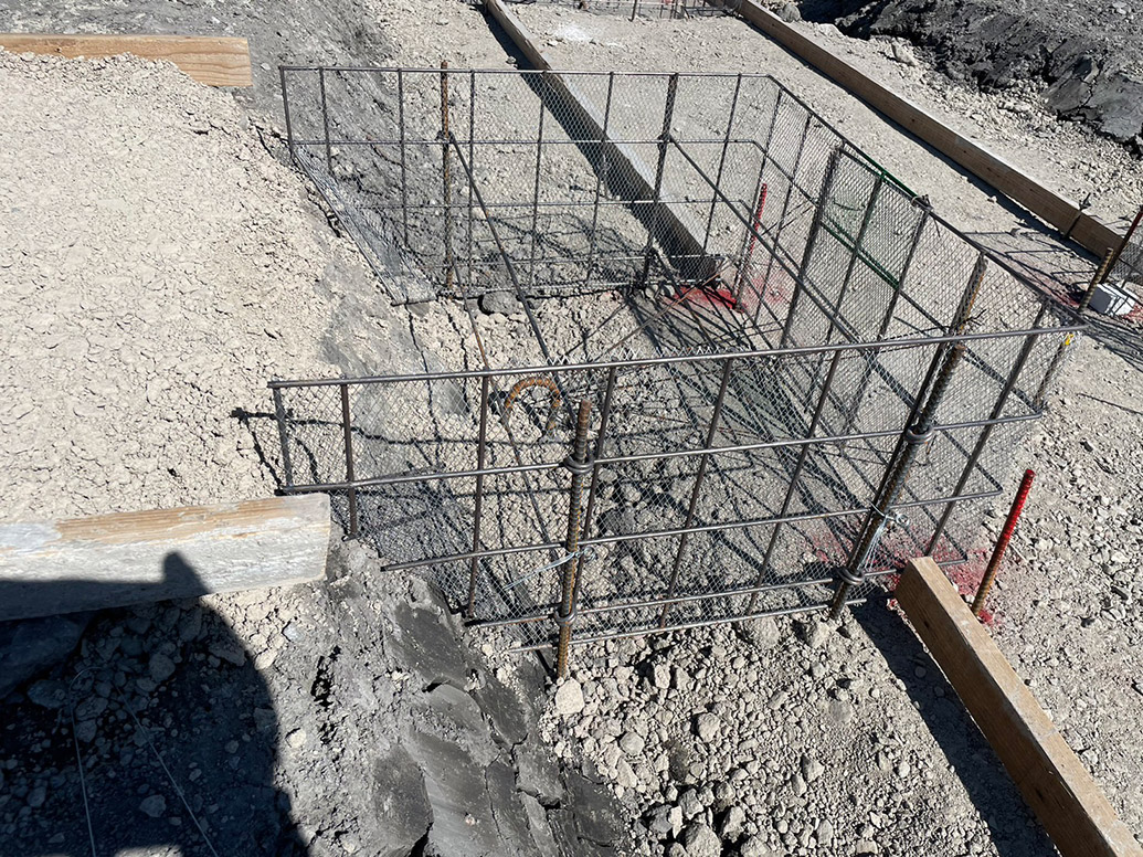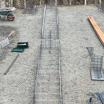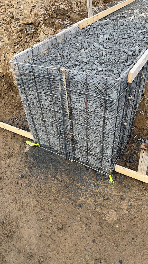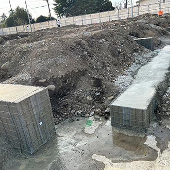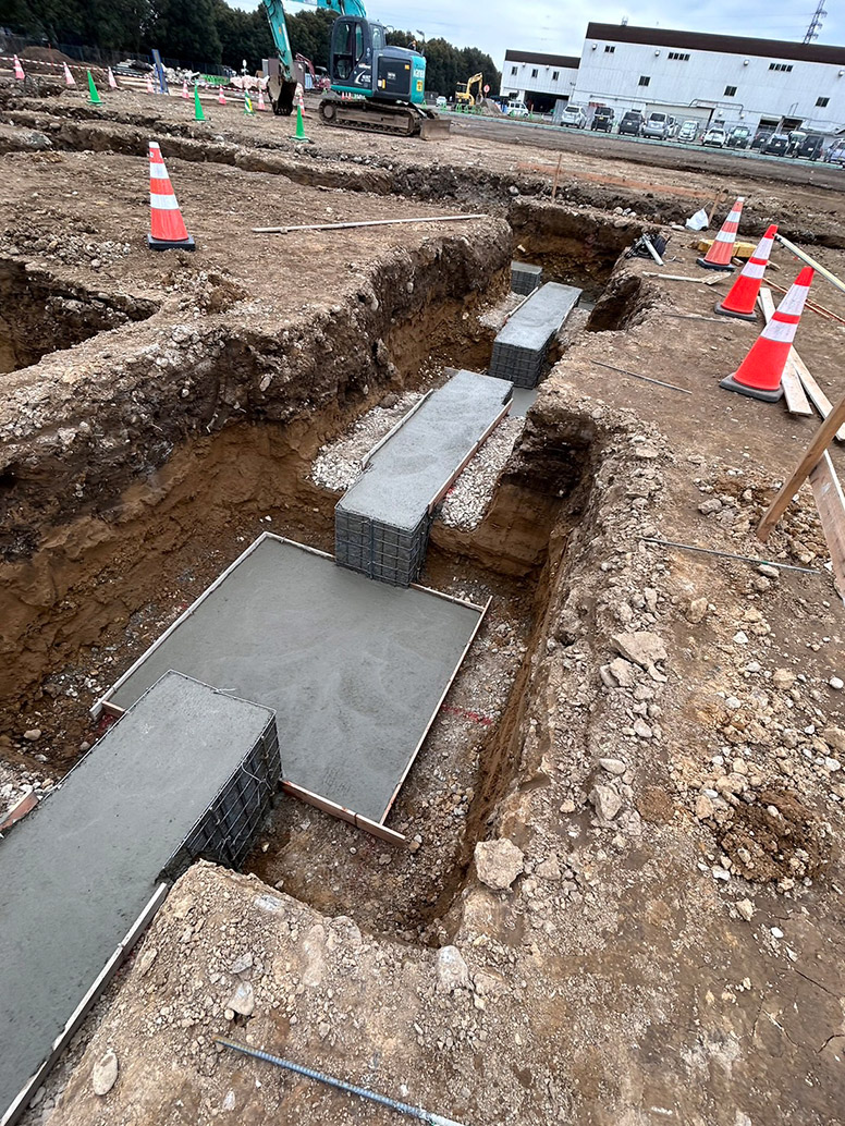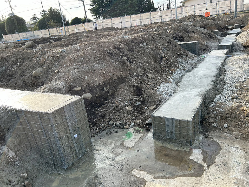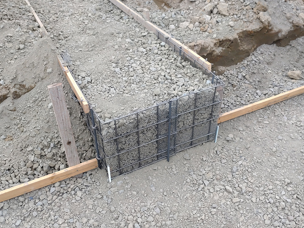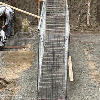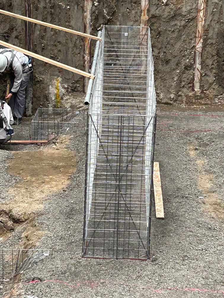 基礎地中梁の梁下を捨てコンクリート前に、アミ枠を設置し基礎基準コンを打設することにより、基礎施工効率化と後の沈下防止にもつながる工法です。